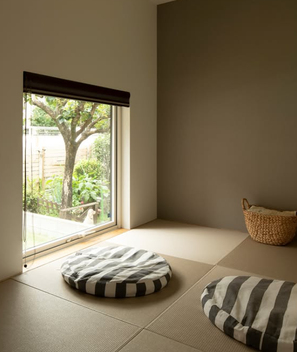 ゆったり和室ベンチ、テラスを眺めながらワークスペースや食事スペースなどできるスペースです